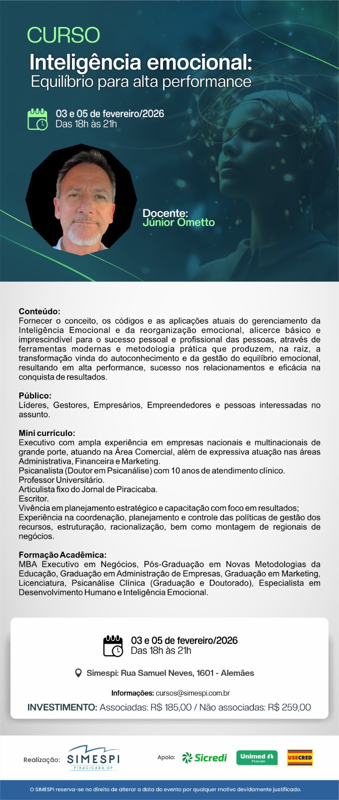 Nos dias 03 e 05 de fevereiro, acontece o curso Inteligência emocional: equilíbrio para alta performance, comandado pelo psicanalista Júnior Ometto. Os encontros têm duração de três horas cada um e pretendem mostrar o conceito e as aplicações do gerenciamento da inteligência emocional e reorganização emocional na vida profissional.